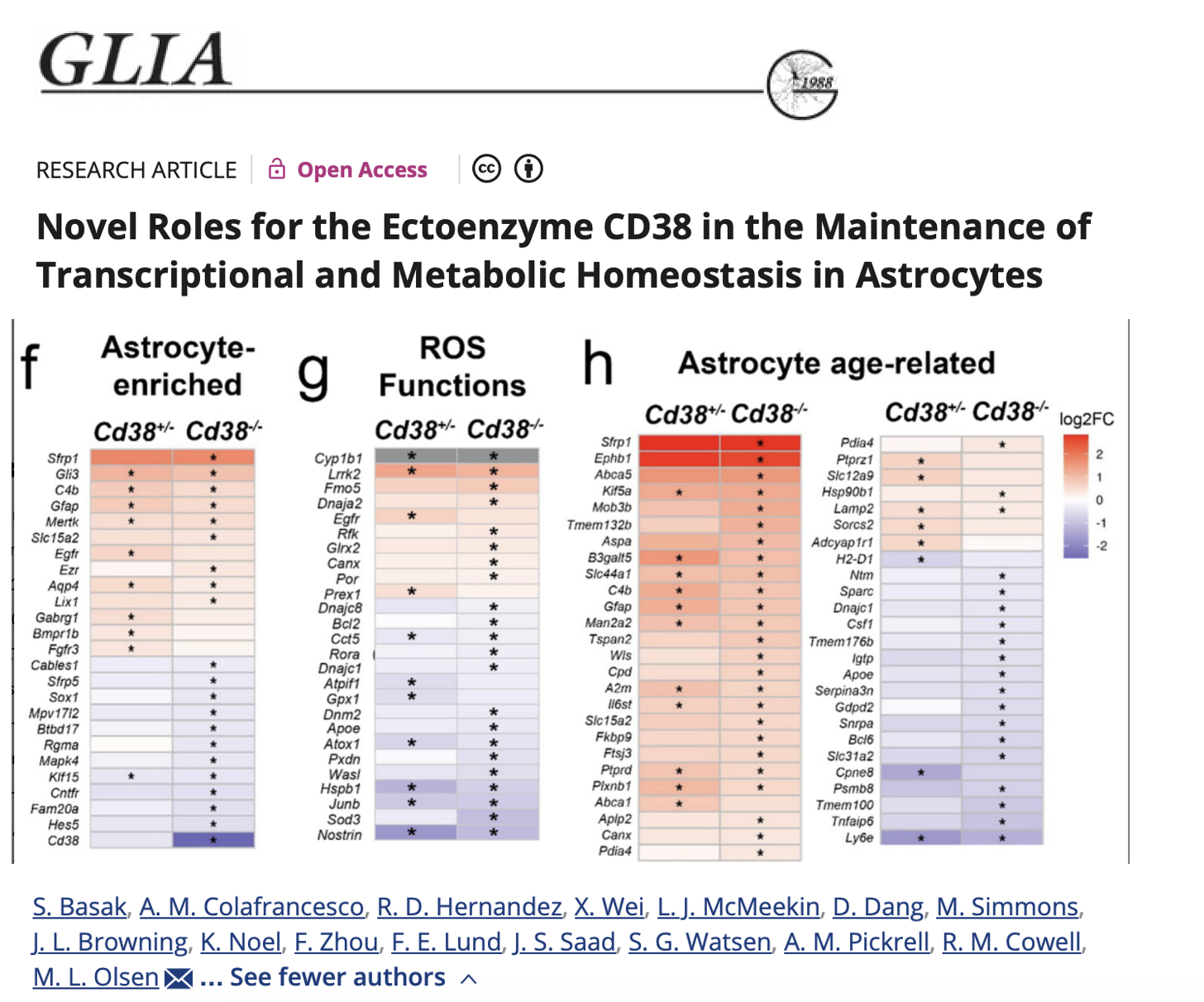In this collaboration with the Cowell lab we identify a novel role for astrocytes in the regulation of CD38-dependent NAD/NAM homeostasis in the brain and provide a framework for future studies evaluating the relationship between CD38 dysfunction, aging, and vulnerability of neuronal populations in neurodegenerative disease.